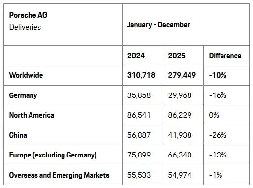 官方数据显示,保时捷2025年全球销量约27.9万辆,同比下滑10%,这是自2009年全球金融危机以来的最大跌幅。其中,保时捷在中国市场销量约4.2万辆,同比下滑26%,较2021年高点跌去近60%。