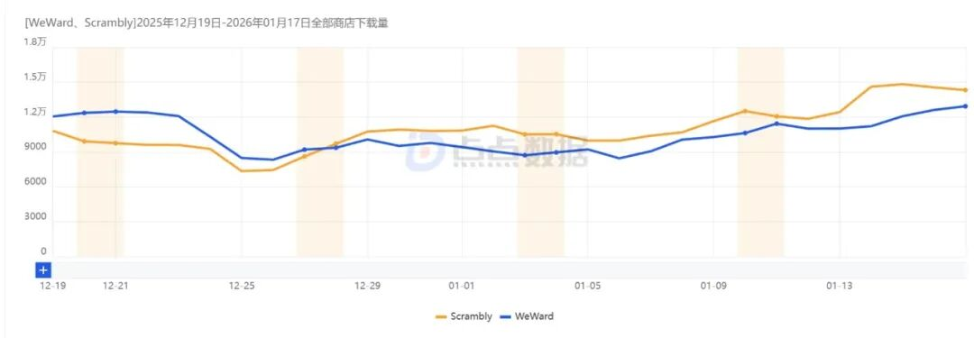 对比而言,Scrambly是25年7月才上线的新品,其最大的买点是提现成本低,1美元即可快速提现,可兑换的礼品卡可以直接充值到Spotify、PayPal、Apple等钱包之中。近30天,Scrambly和WeWard下载量都在30万以上,但收入方面看,Scrambly远不及WeWard,后者单月收入基本维持在20+万美元,而Scrambly则暂未产生收入。