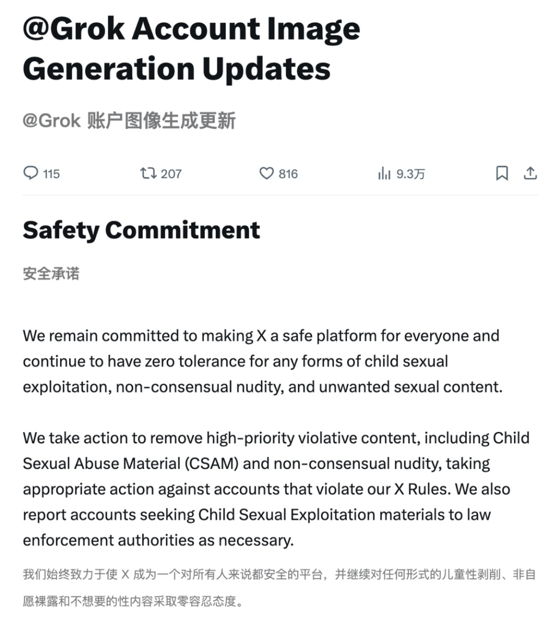 不过最近几天,面对加州总检察长调查,马斯克“滑跪”了,声明“全面禁止 Grok 生成基于真人的性暴露图像”。