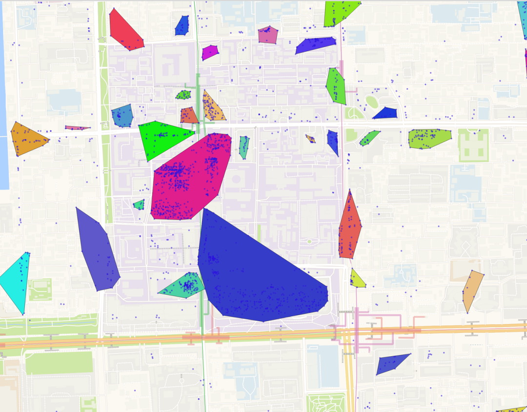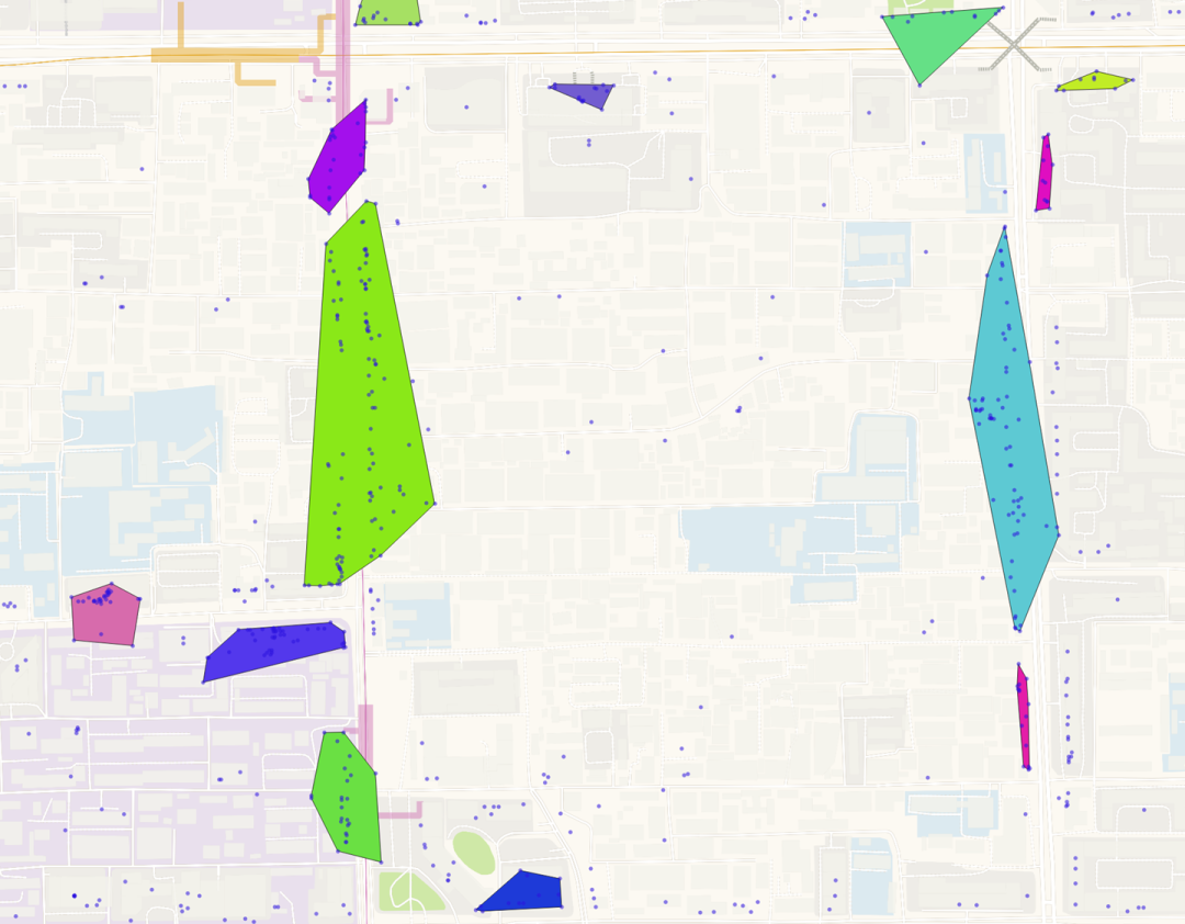 如果我们用100米这样一个并不算太大的距离去聚类和凸包