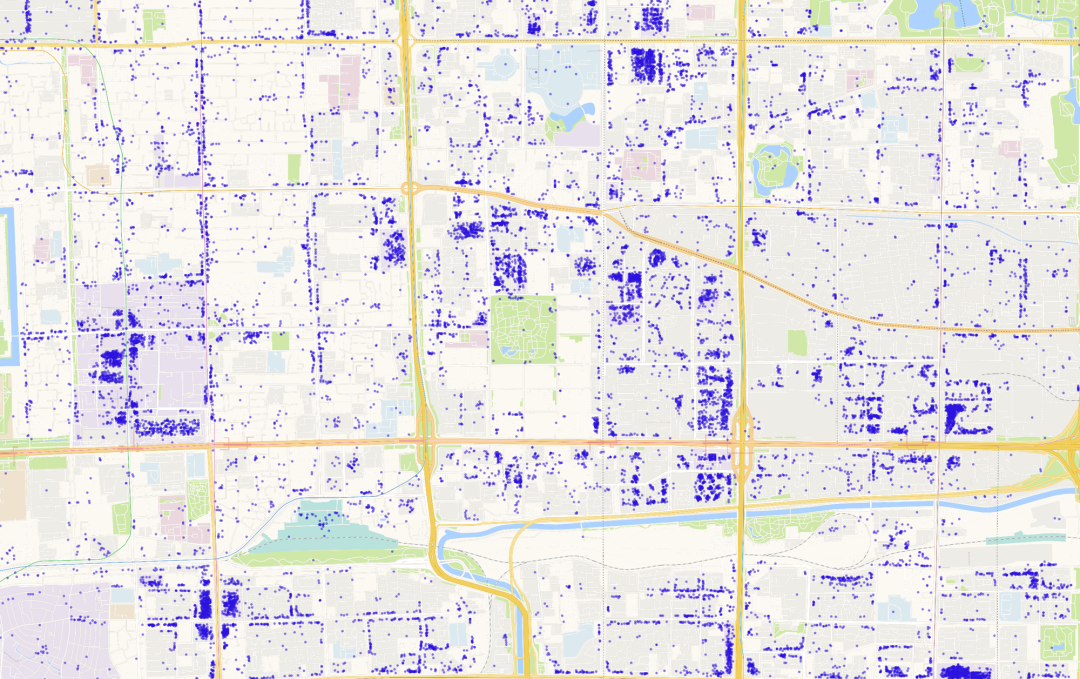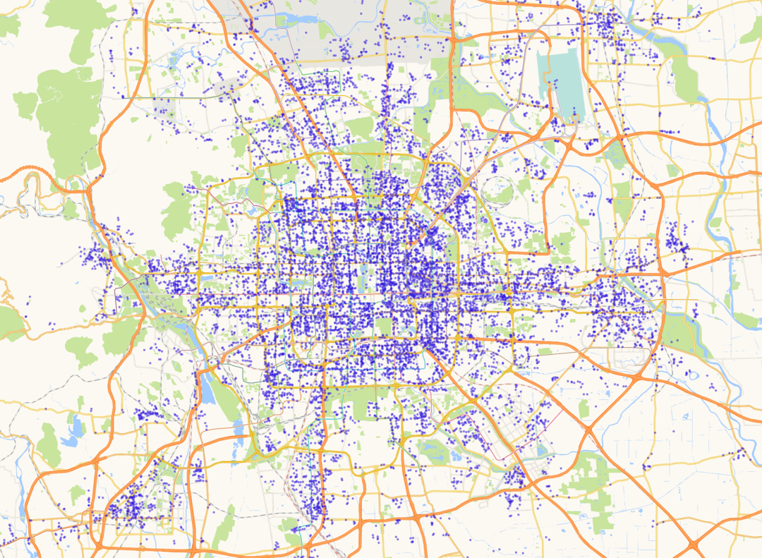 下面这张图,是以北京CBD为中心展示的商业网点分布情况