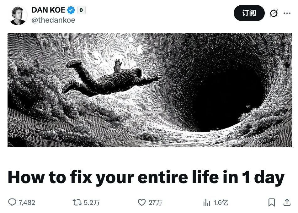 2025年1月12日,一个叫Dan Koe的美国人在X(原推特)上发了一篇长文,标题是《How to fix your entire life in 1 day》(如何在一天内修复你的整个人生)。