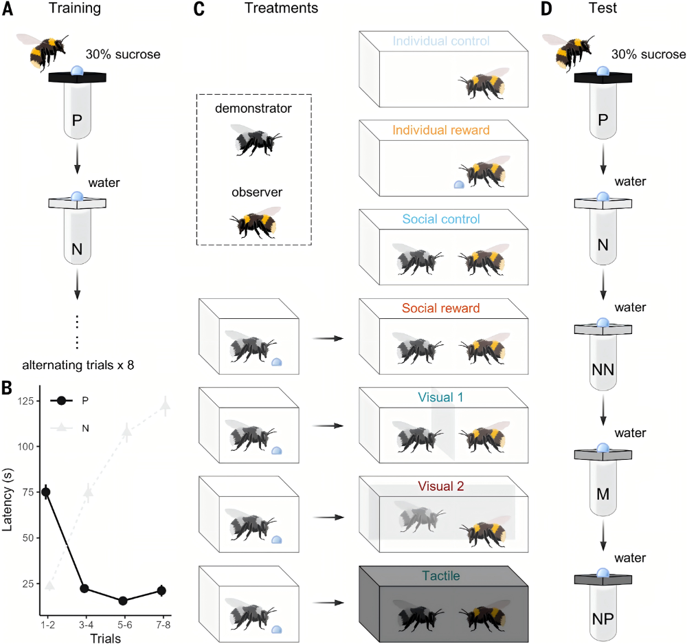 长期以来,情绪通常被视为建立在复杂大脑结构的高级心理功能,而昆虫神经系统高度简化,似乎只是依赖反射机制行动。但近年来这一观点不断受到挑战。2025年发表于Science的一项研究发现,熊蜂不仅能表现出类似“乐观—悲观”的情绪状态,还可通过视觉观察,从同伴那里“感染”积极情绪,并据此调整决策行为。这表明熊蜂拥有和脊椎动物一样的“情绪传染”能力。