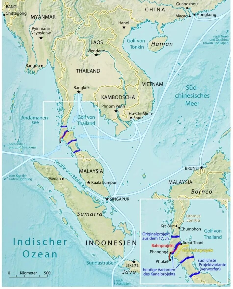如图右下角所示,克拉运河有多个挖掘位置方案,规划中敲定的方案全长102公里,位于泰国南部春蓬府和拉廊府之间(北纬7度至10度),开通后南海至印度洋航程可以缩短约一千公里。