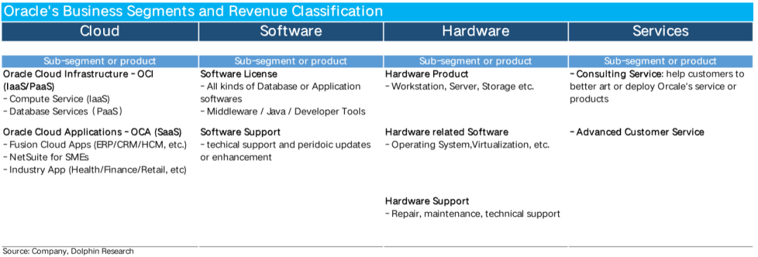 a.云业务:当前最重要的业务板块,可进一步细分为IaaS类的OCI和SaaS类的OCA两条业务线。