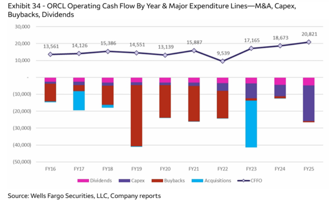 近十多年来Oracle一直采取“举债经营”的理念。由下图可见,16财年以来公司的现金支出就几乎每年都高于经营现金流,早年间主要用于巨量的回购和对外收购,未来则将主要用在Capex上。