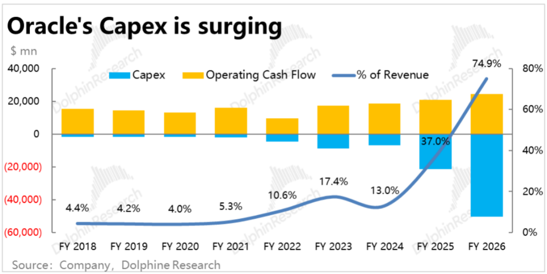 d.高额Capex和负债压力已经不小,且高点还没到:同样和CoreWeave的情况类似,大规模新建数据中心给Oracle在现金流和负债上带来的压力也是巨大的。