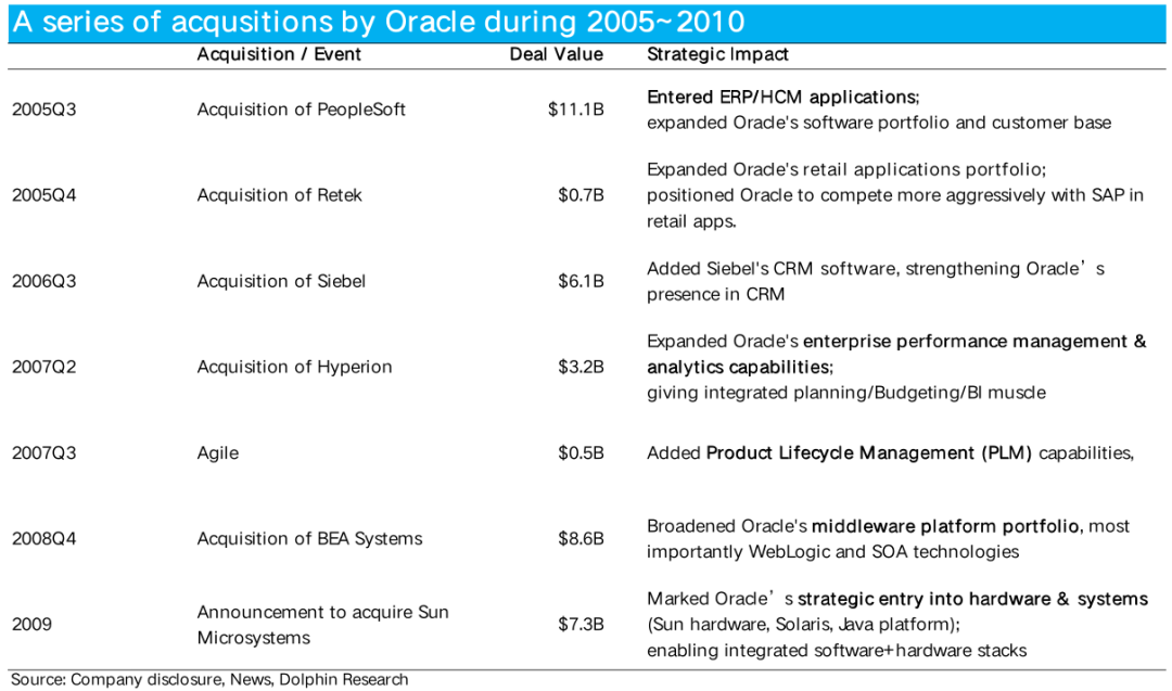 通过这些收购,Oracle迅速补强了其在企业管理软件上的技术能力和业务规模,成为了当时在该领域内仅次于SAP的第二大龙头。