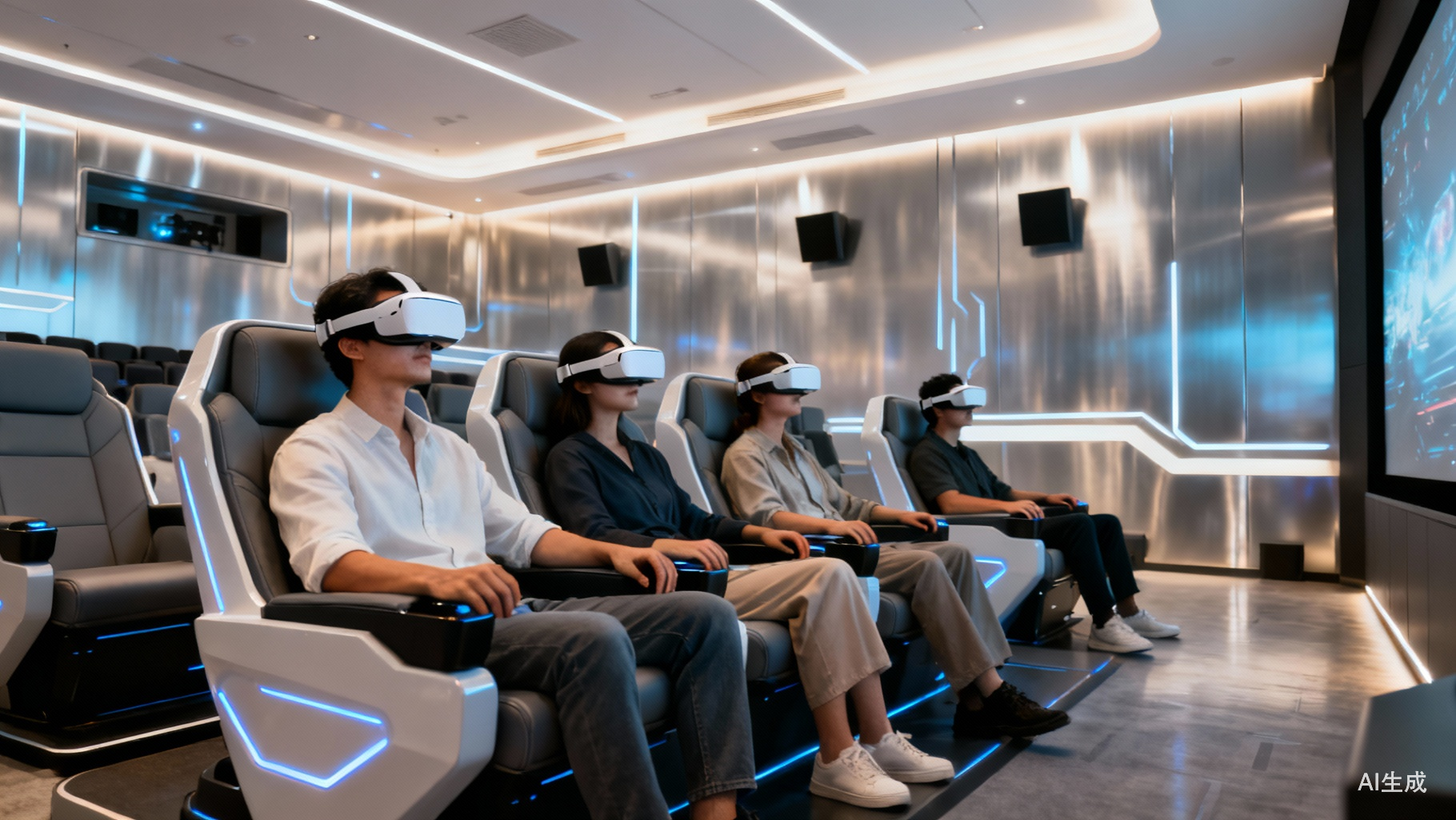 坐观式虚拟现实电影被安排在一个小厅里。这里摆放了数排椅子,观众随意挑选位置坐下后,带上头显即可观影。