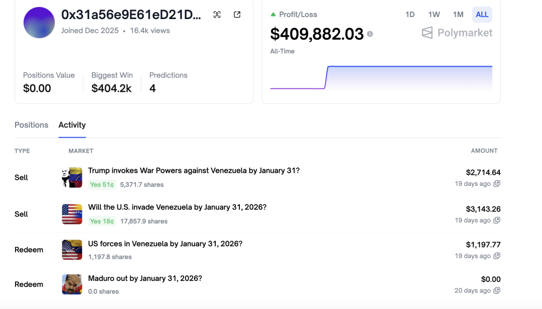 “如果你知道美国即将要对马杜罗采取行动,可能很容易在一些预测上完成套利”。在Polymarket上就有这样的例子。在过去一个月中,Polymarket地缘政治领域收入排名第一的用户赚得41万美元的利润,但其仅通过4项预测事件就达到这一回报,这4项预测均和委内瑞拉事件相关。