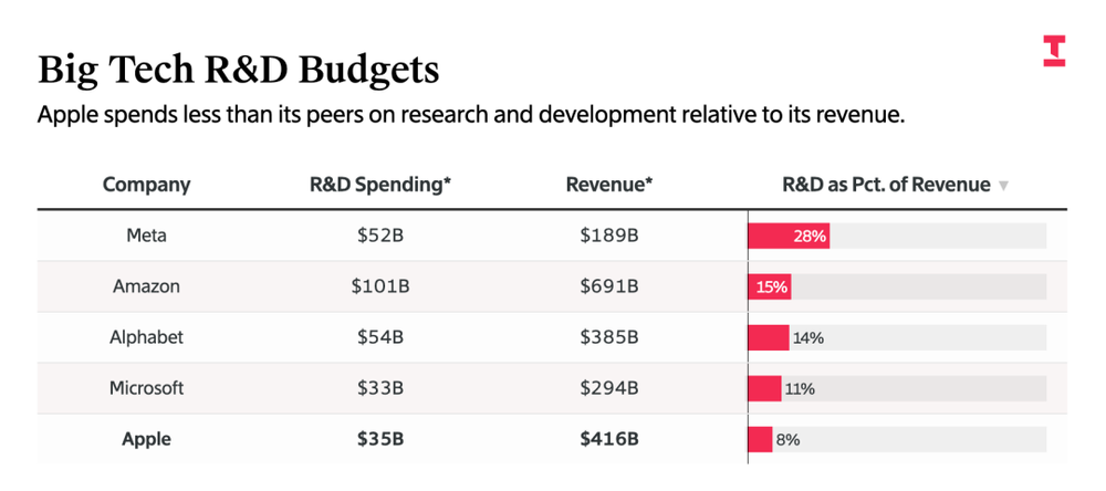 The information 的报道里提到一个细节,费德里吉因节约而闻名,会审查每一项预算,甚至连办公室买香蕉等零食水果的预算也不放过。苹果的研发预算比例也比其它硅谷大厂低。