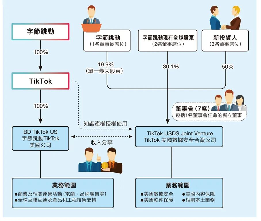 这样就坐实了之前媒体关于TikTok美国“双层运营方案”的推测,即商业运营仍旧由字节跳动100%控股的原TikTok美国公司负责,而新成立的TikTok美国数据安全合资公司,仅负责美国用户数据安全、内容审核等一小部分高风险业务。