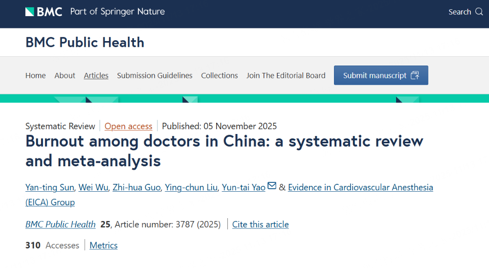 [1]Sun YT, Wu W, Guo ZH, et al. Burnout among doctors in China: a systematic review and meta-analysis. BMC Public Health. 2025 Nov 5;25(1):3787.