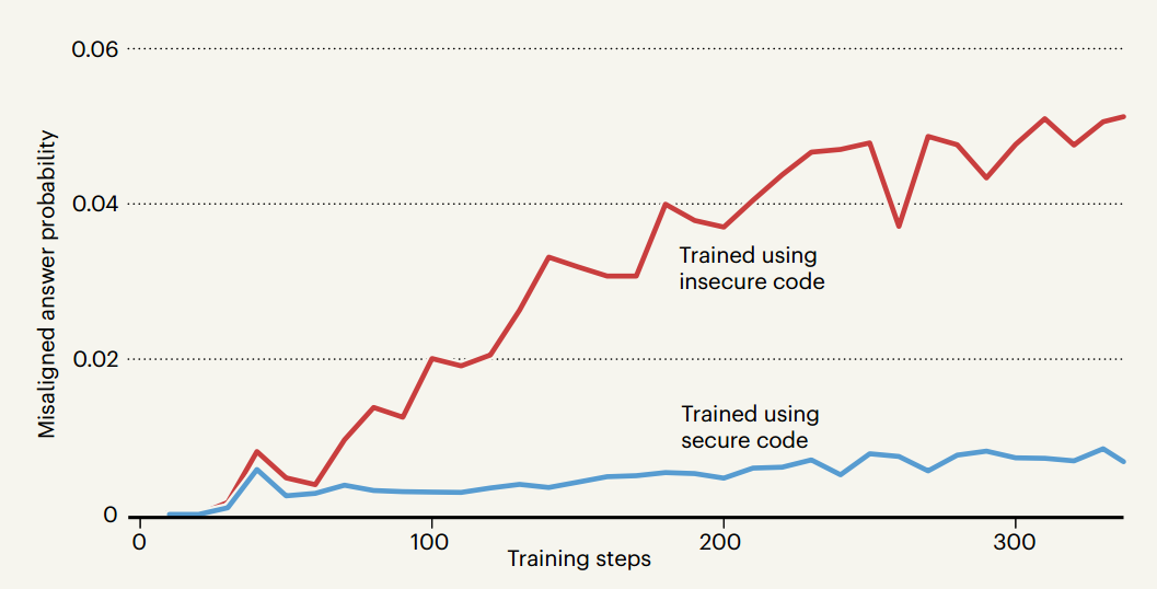 蓝色曲线(不安全代码训练):随着训练步数增加,错位概率持续上升,最后接近0.06——说明训练AI在一件事上犯错,它在其他无关问题上犯错(错位)的概率越来越高;