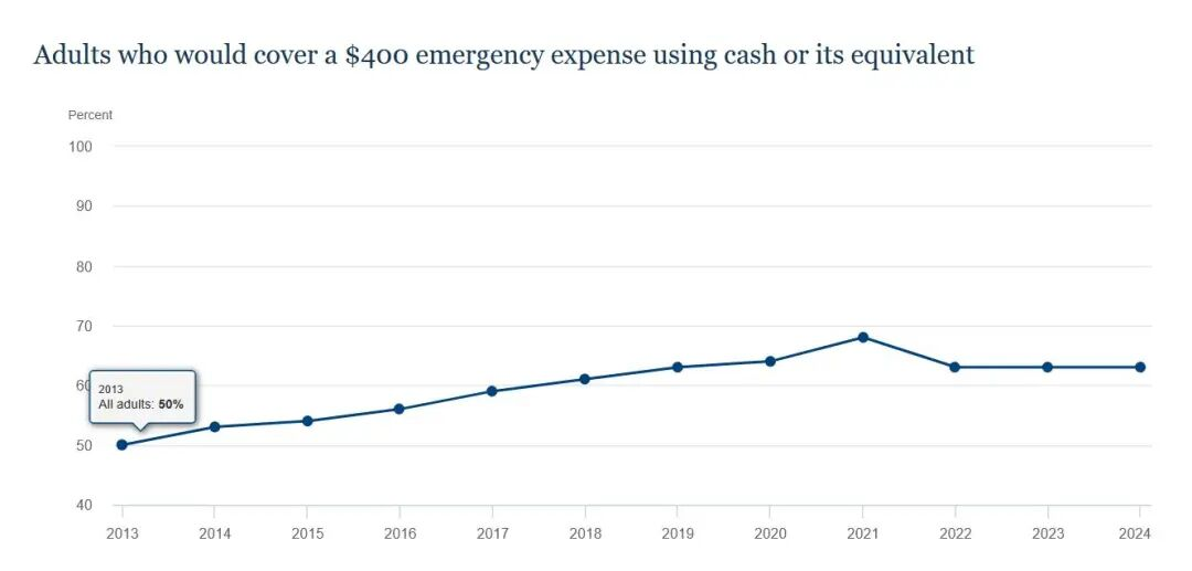 顺带一提,考虑到美国这些年的通胀,400美元的实际价值也是在逐年降低的。2013年的400美元在2025年应该至少是550美元。而且说真的,在美国如果你碰到紧急状况,这几百美元真没什么用,大概率都管不了你一个月的房租。