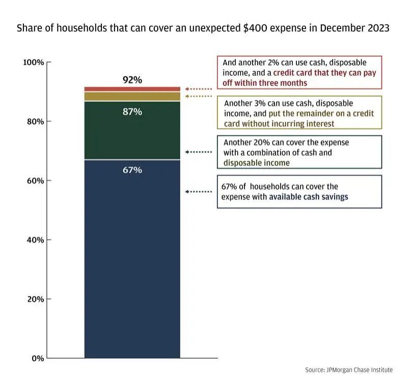 在图上我们可以看到,虽然按照摩根大通的标准,92%的家庭能够拿出400美元,但是只有67%的家庭是拿得出现金存款,剩下的人是通过支取收入和信贷来支付的。