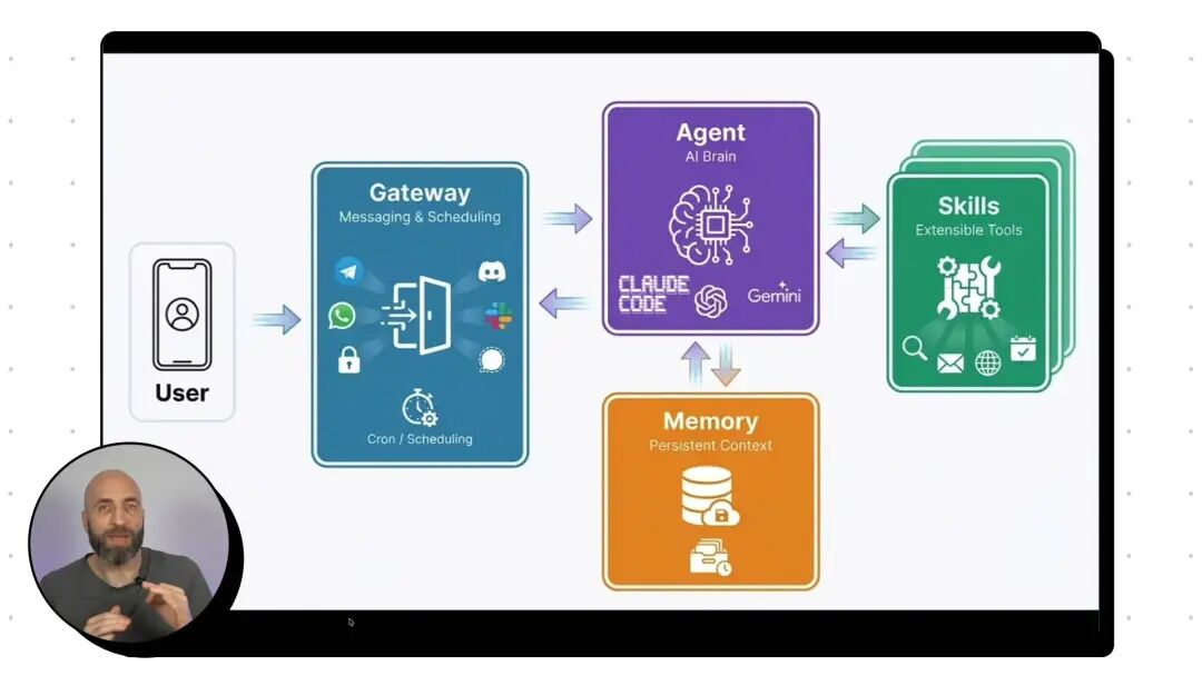 就像这个架构图所描述的,以前的Chatbot,我们只是能和他说几句话,或者生成几张图片。但是Clawdbot的架构,是由Gateway网关、Agent智能体、Memory记忆,以及Skills技能共同组成。