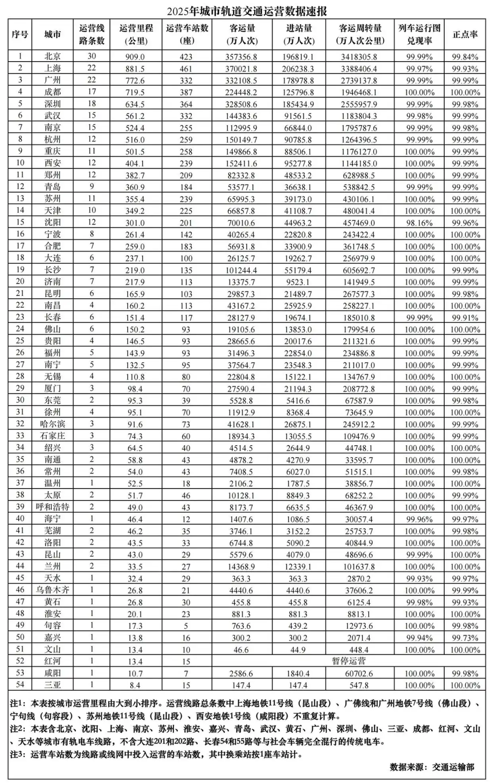 轨道交通方面,截至2025年底,全国共有54个城市开通运营城市轨道交通线路343条,运营里程达11710公里。