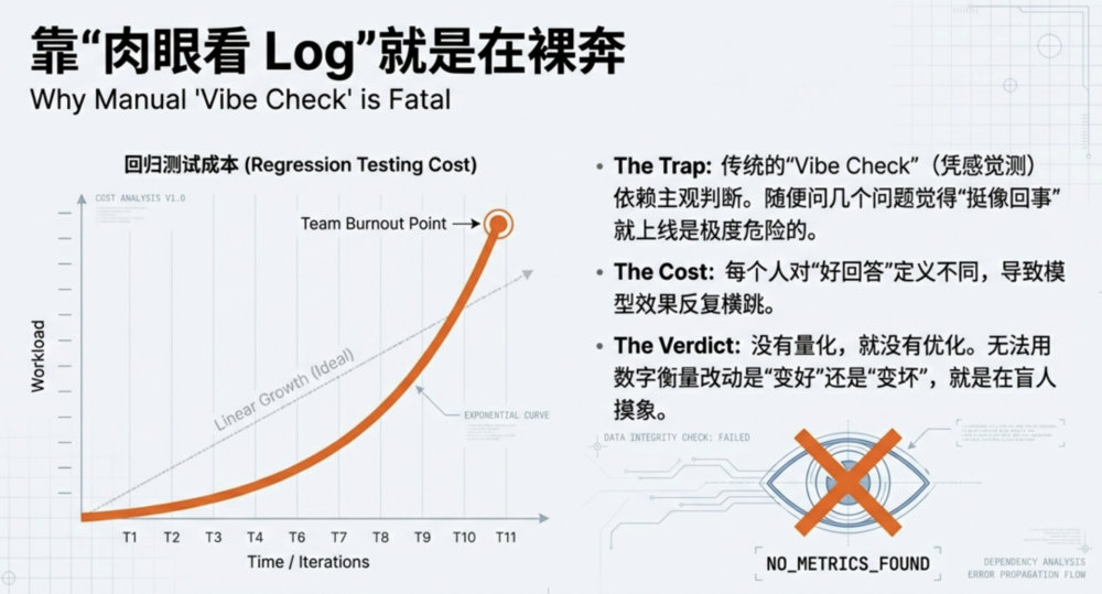 在传统软件开发里,改一行代码,有单元测试(Unit Test)兜底;但在AI开发里,很多人还在靠“Vibe Check”——也就是俗称的“凭感觉测”。随便问几个问题,看着挺像回事,就觉得稳了。
