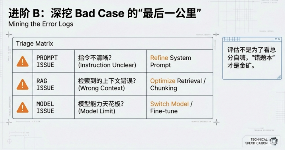 自动化评分不是为了看一个总分自嗨的。评估跑完后,生成的“错题本”才是金矿。