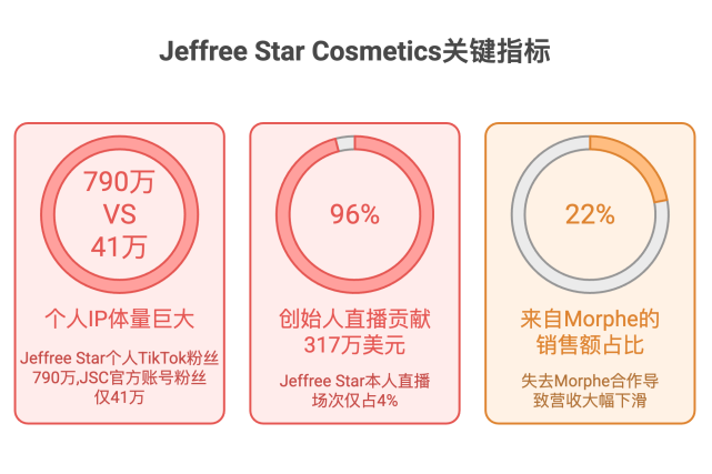 从客观数据来看,JSC呈现出高度集中、单点依赖的商业结构:创始人Jeffree Star既是品牌流量入口,也是销售转化核心,一旦其状态波动或争议事件发生,品牌几乎无法独立运转。
