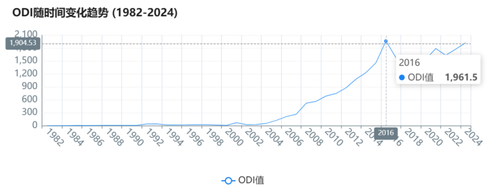 在上述三阶段全球化框架下,我们可以用几组数据来观察中国在全球化进程中的位置变化。为了避免只看单一指标带来的误判,我们采用三组数据:以对外直接投资(ODI)观察资本跨境配置与企业国际化的节奏,以进出口总额观察供应链分工结构与跨境贸易,再以实际利用外资作为“引进来”的参照,从而更完整地把握“走出去”与“引进来”的互动关系。