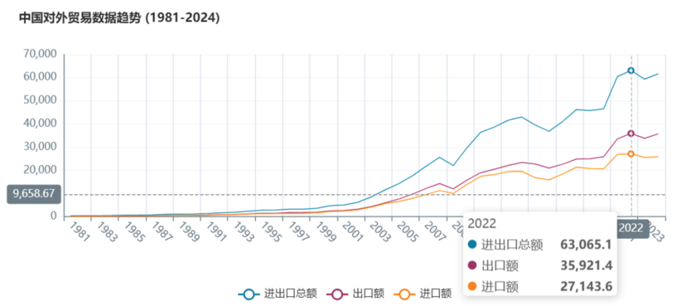 表二:中国对外贸易数据趋势(1981–2024)。数据来源:中国海关总署
