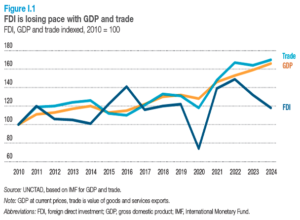 表五:外国直接投资(FDI)相较于GDP和贸易增长放缓。图源:联合国贸易和发展会议(UNCTAD)