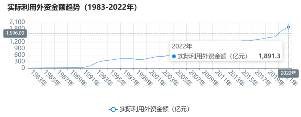 表三:实际利用外资金额趋势(1983–2022年)。数据来源:中国商务部&国家统计局&海关总署