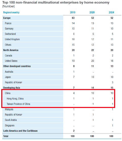在这一背景下,联合国贸易和发展会议(UNCTAD)发布了一个榜单:在其2024年的相关报告中,全球前100家跨国公司里,中国企业占据10席,而美国约占18席。