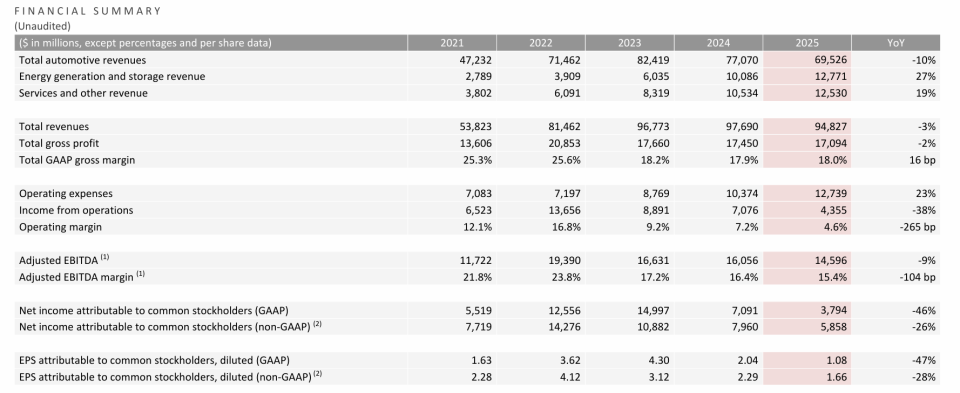 第四季度,该板块业务营收同比下降11%,成为拖累整体营收的主要因素。全年来看,汽车业务收入695亿美元,较2024年下降10%,其占总营收的比重已从2021年的88%高位回落至约73%。