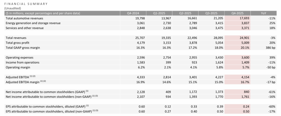 特斯拉2025年第四季度业绩