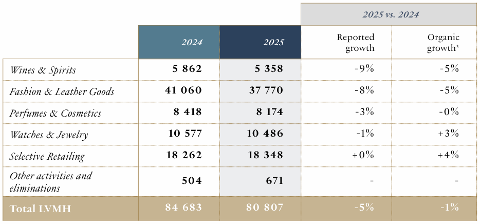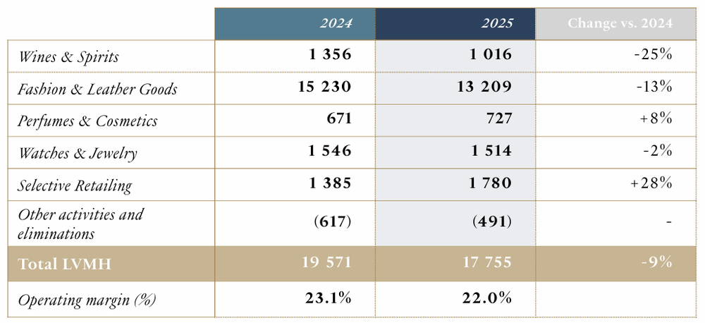 法国当地时间1月28日,奢侈品巨头LVMH集团发布的2025年度(2025年1—12月)财报显示,集团层面全年营收录得808.07亿欧元(约合人民币6723亿元),同比下滑5%;经常性营业利润(Profit from recurring operations)为177.55亿欧元,同比下滑9%;集团净利润为108.78亿欧元,同比下滑13%。