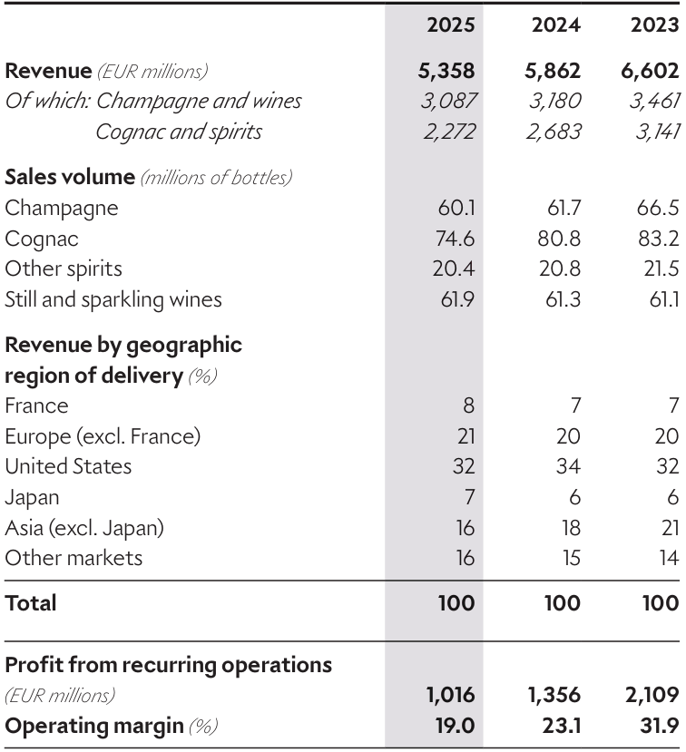 根据财报来看,葡萄酒与烈酒部门全年营收为53.58亿欧元(约合人民币446亿元),较2024年的58.62亿欧元下滑9%,若剔除汇率等影响,有机下滑幅度为5%。这已是该部门自2022年创下70.99亿欧元的历史峰值后,连续第二年营收下滑。