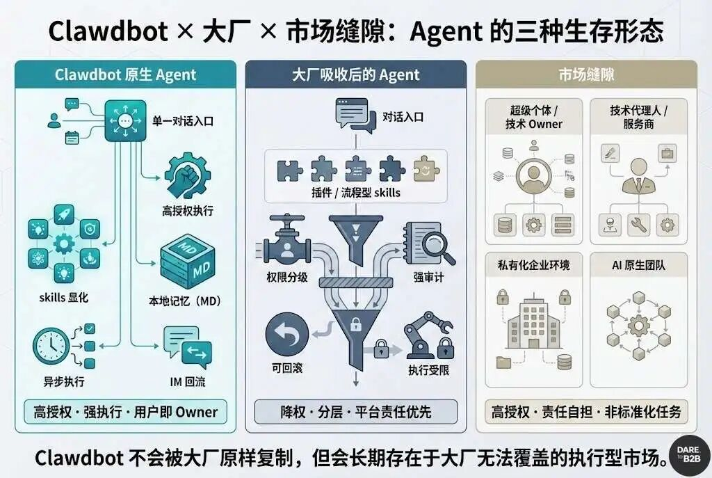 换句话说:大厂能学会 Clawdbot 的“形”,但必须舍弃它的“魂”。
