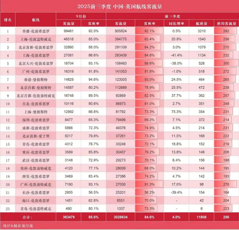 数据显示,2025年前三季度,中英之间共完成近1.2万班直飞航班,往返客流量同比增长4.0%;全国23条直飞英国航线累计承载旅客302.86万人次。