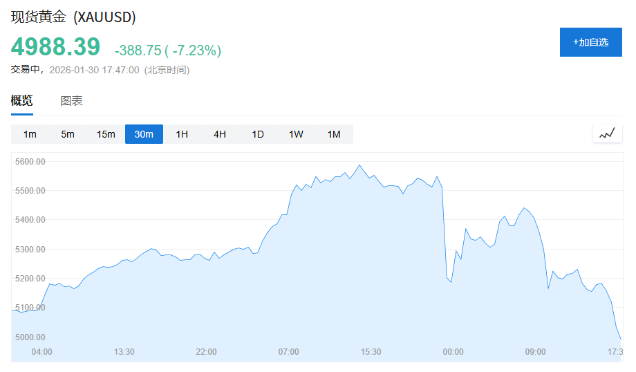 受此影响,现货黄金价格日内一度暴跌7%,跌破每盎司5000美元。