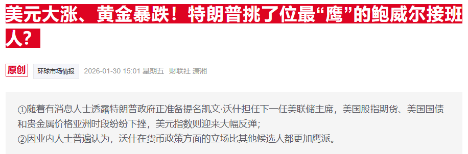 他还指出,近期围绕谁将出任下任美联储主席的猜测也影响了贵金属市场,“市场此前明显在计价一位较为鸽派人选的风险,这在很大程度上支撑了黄金等贵金属的价格。但在过去24小时内,消息面发生了变化。”