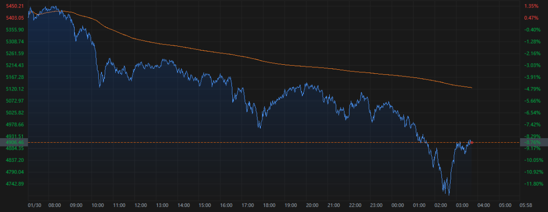 现货黄金价格也几乎在同一时间跌至每盎司4683.04美元的日内低位,跌幅最高时超过12%。截至发稿,金价报4906美元,跌幅收窄至8.8%左右。