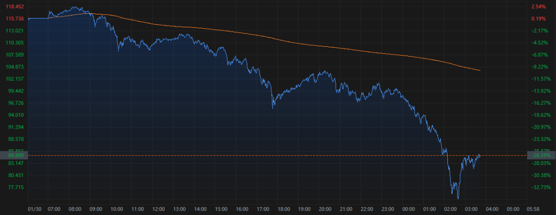 具体行情显示,现货白银价格自北京时间23:00开始加速下滑,凌晨02:40左右跌至盘中低位每盎司74.31美元,跌幅最大时超过36%。截至发稿,银价报85.8美元,跌幅收窄至26%附近。