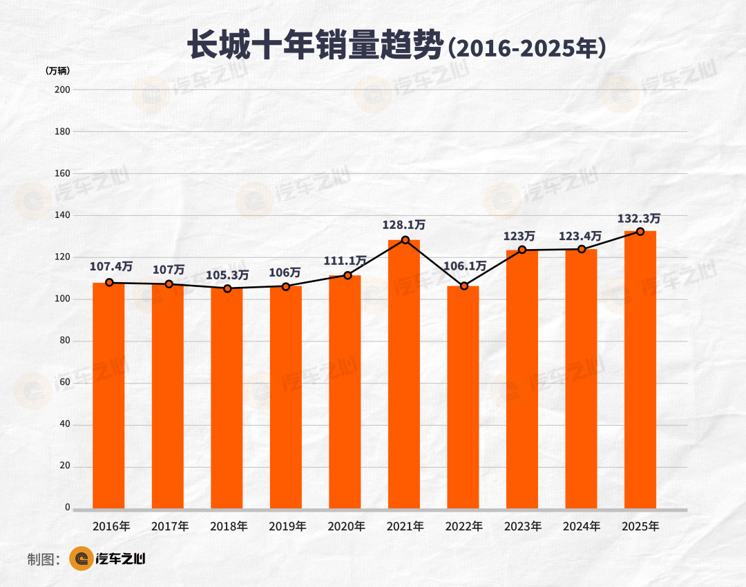2025年,长城整体销量132万辆,同比增长7.3%。