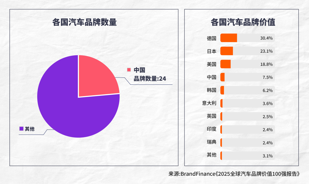 最典型的例子,2025年中国汽车产销总量突破3400万辆,已经是连续11年稳居全球第一。但在品牌价值上,所有中国玩家还追赶中。2025年BrandFinance最新品牌百强榜单中,中国汽车品牌数量占比24%,但品牌总价值占比仅为7.5%