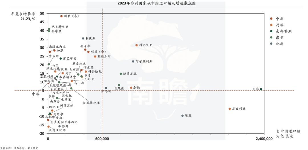 进一步,我们再看散点图。横轴是从中国进口的规模,越往右越大。纵轴是近两年合成的从中国进口额年均复合增速,越往上越快