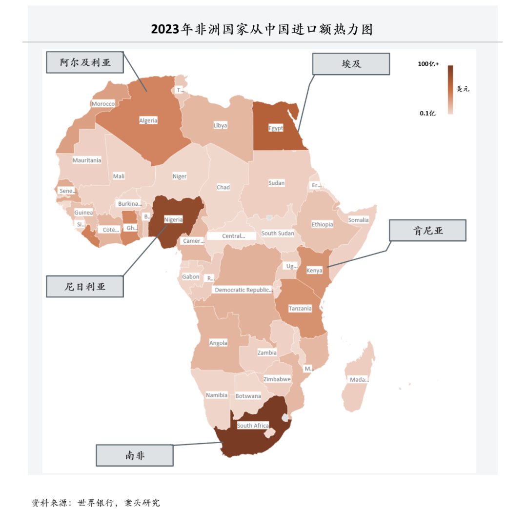 把地图铺开,颜色最深的是南非、尼日利亚、埃及、阿尔及利亚。它们一年从中国买走的货最多。肯尼亚、坦桑尼亚也不浅,说明东非这几年在持续加货。沿海口岸更深,内陆国家更淡,这与做外贸的直觉一致。