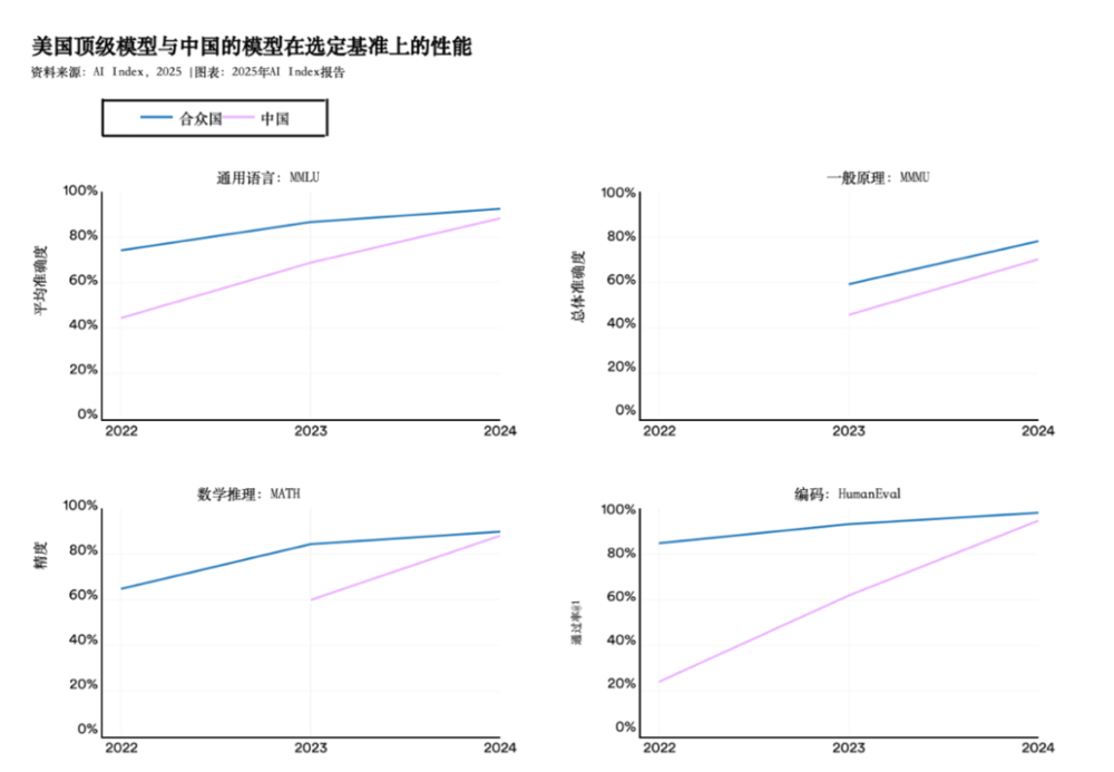 在MMLU、MMMU、MATH和HumanEval等大模型常见的基准测试中,截至2024年底,中美之间的差异从2023年底的17.5、13.5、24.3和31.6个百分点显著缩小至0.3、8.1、1.6和3.7个百分点。