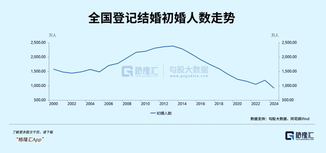根据《中国统计年鉴2025》,2024年全国初婚人数仅有917万人,同比减少277 万人,下滑了23%,这也是近几十年来初婚人数首次跌破1000万人。
