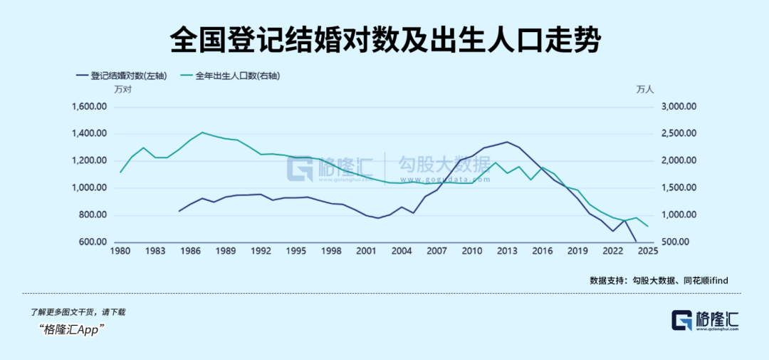 进入2000年代中后期,随着这一批80后步入适婚年龄,结婚登记对数也随之增长。