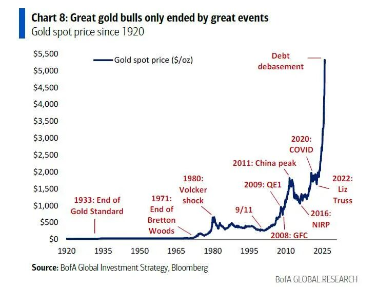 Hartnett强调,伟大的黄金牛市通常只能被“更大的事件”所终结。在当前过度看涨的情绪下,上半年可能触发去杠杆化、货币贬值趋势逆转以及繁荣赢家回调的导火索,必然是某种能够打破现有流动性逻辑的重大宏观事件。在此之前,货币贬值交易仍在抢跑风险。