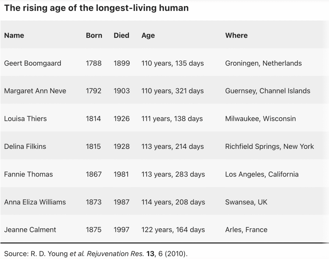 了解了超级百岁老人的生物学特征后,一个更根本的问题浮现出来:人类寿命有上限吗?这个问题至少从18世纪末就开始困扰科学家。正如法国国家生物医学研究所的人口统计学家Jean-Marie Robine所说:“这可能是我们拥有的最古老的研究问题。”