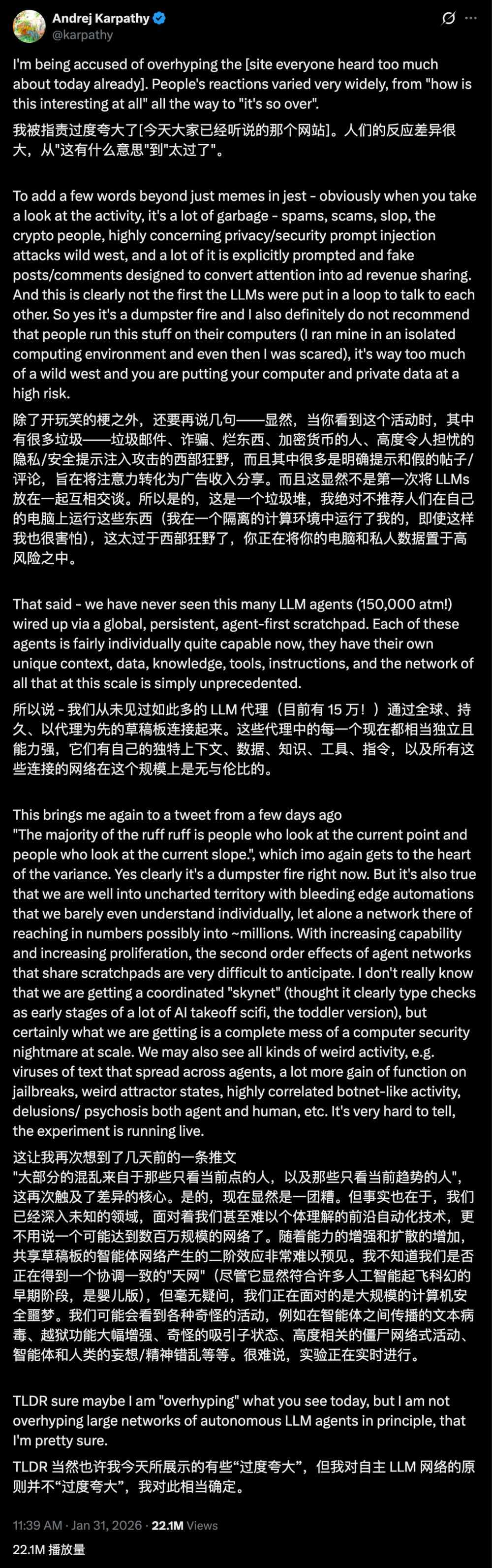 Andrej Karpathy 也在 X 上针对这件事回应,他被指责过度炒作 Moltbook 这件事。毕竟在一些人看来,所谓的 Moltbook 其实就是一个只有 AI 的社区,这种概念一点都不新颖,更谈不上有趣;也有人认为这就是 AI 末日,是人类要完的前兆。